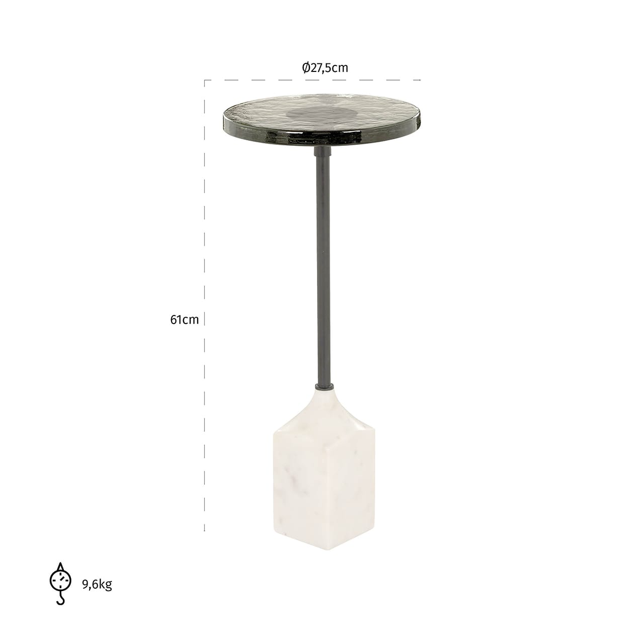 Bijzettafel Aurora 27Ø is een symbool van verfijnde elegantie met zijn glazen blad en een ondersteunende poot van wit marmer. De combinatie van transparant glas en het luxe marmer creëert een tijdloos en chic ontwerp. Perfect voor liefhebbers van minimalistische maar luxueuze interieuraccenten.