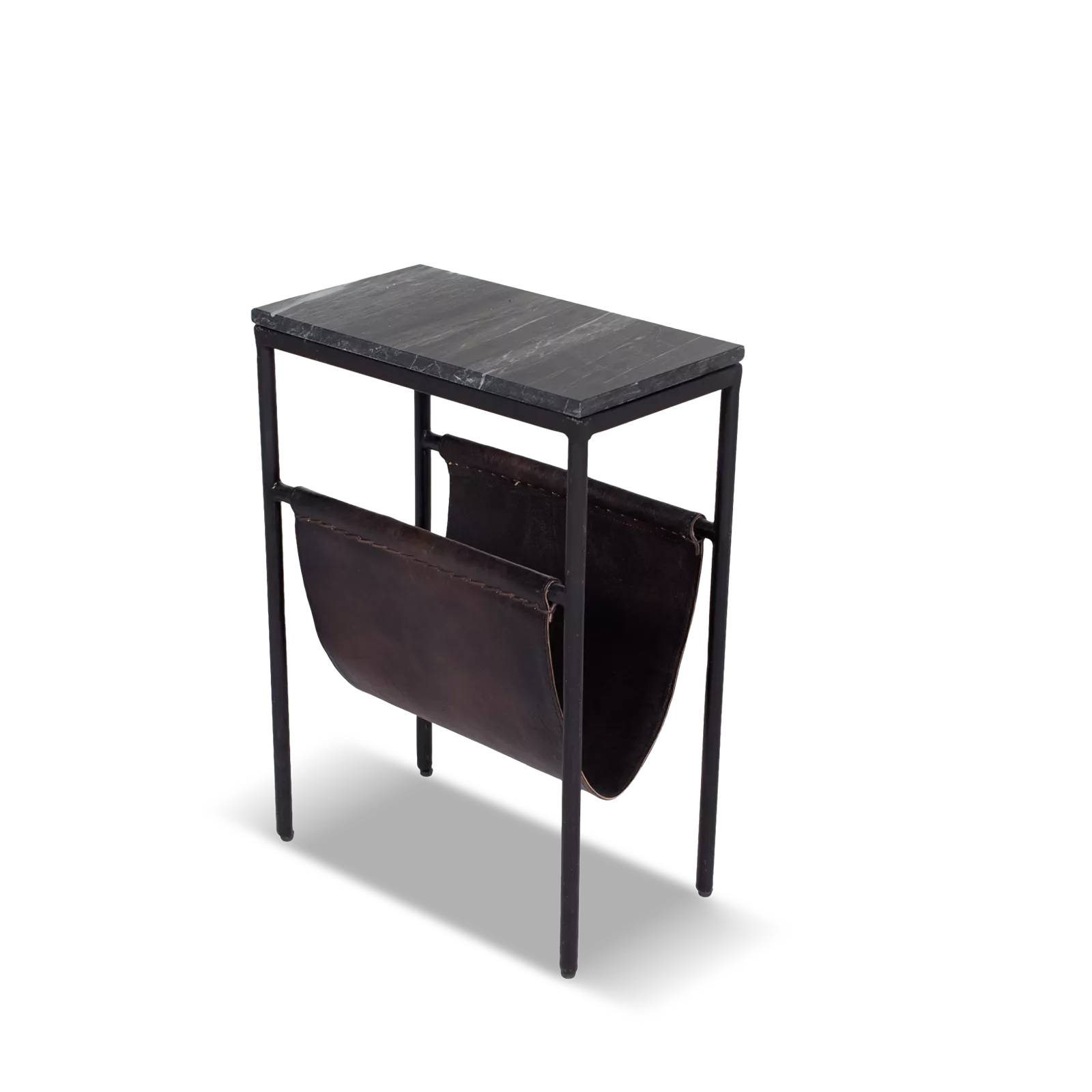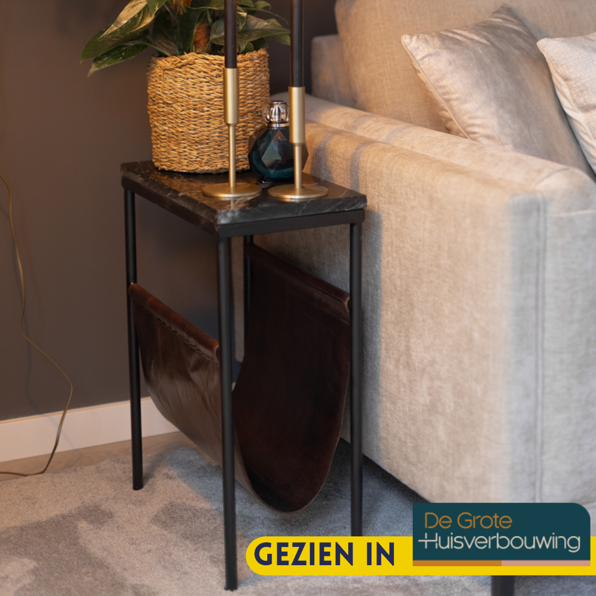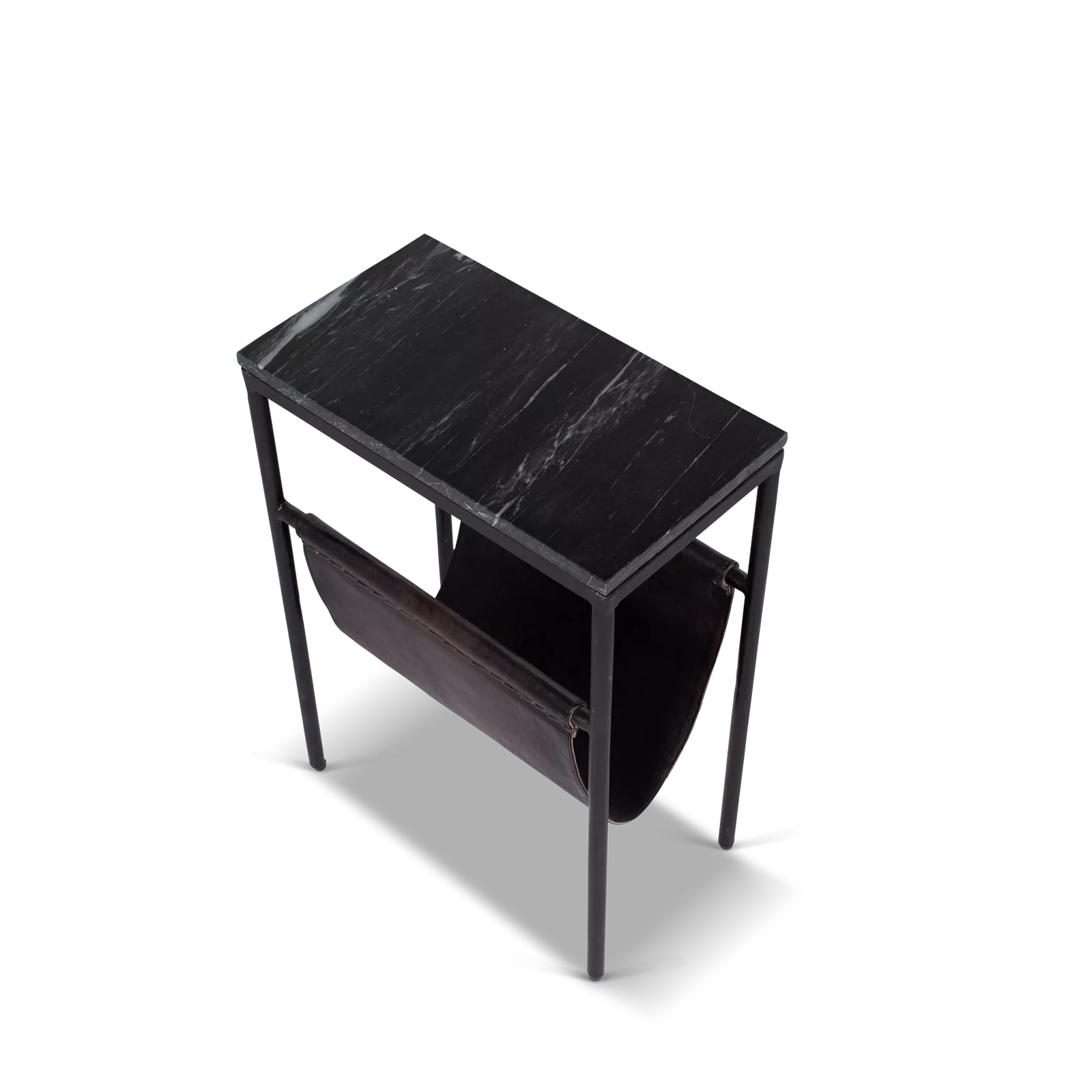 Bijzettafel Bow heeft een zwart marmeren blad. Bow heeft een metalen onderstel met daarin een leren magazinehouder.
