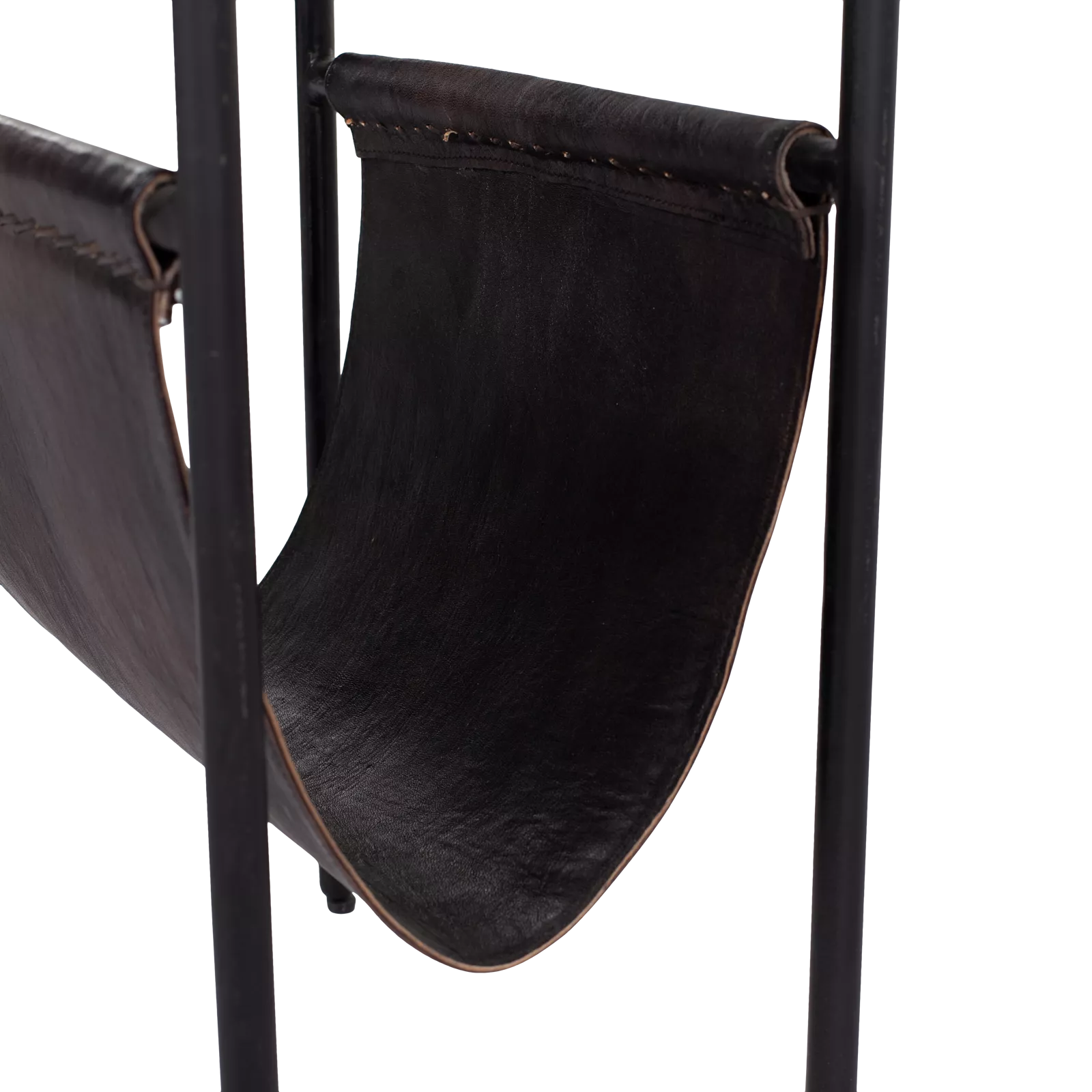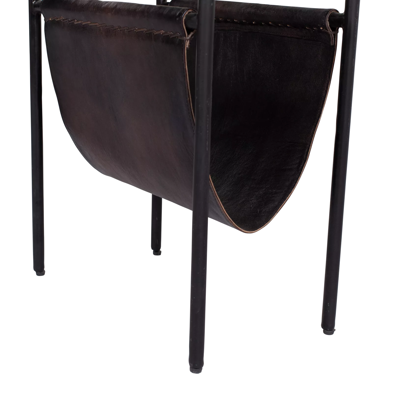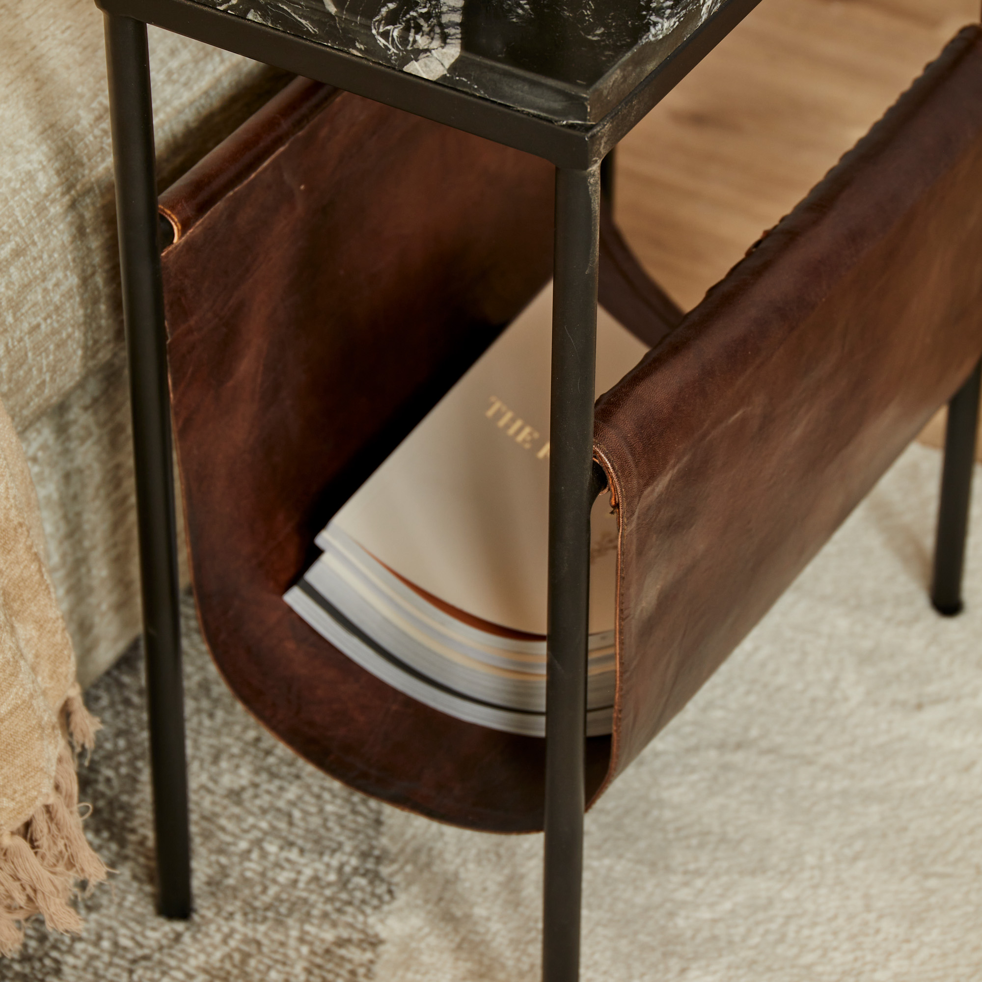 Bijzettafel Bow heeft een zwart marmeren blad. Bow heeft een metalen onderstel met daarin een leren magazinehouder.