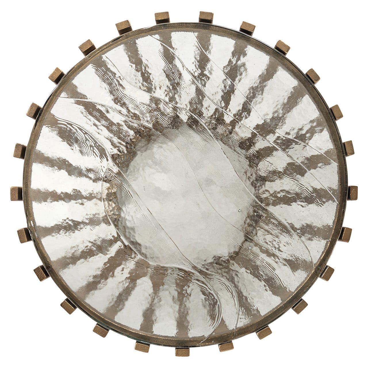 Een stijlvolle bijzettafel met een diameter van 47 cm, vervaardigd uit een combinatie van ijzer en glas. De stevige ijzeren poten ondersteunen het heldere glazen tafelblad, ideaal voor moderne interieurs.
