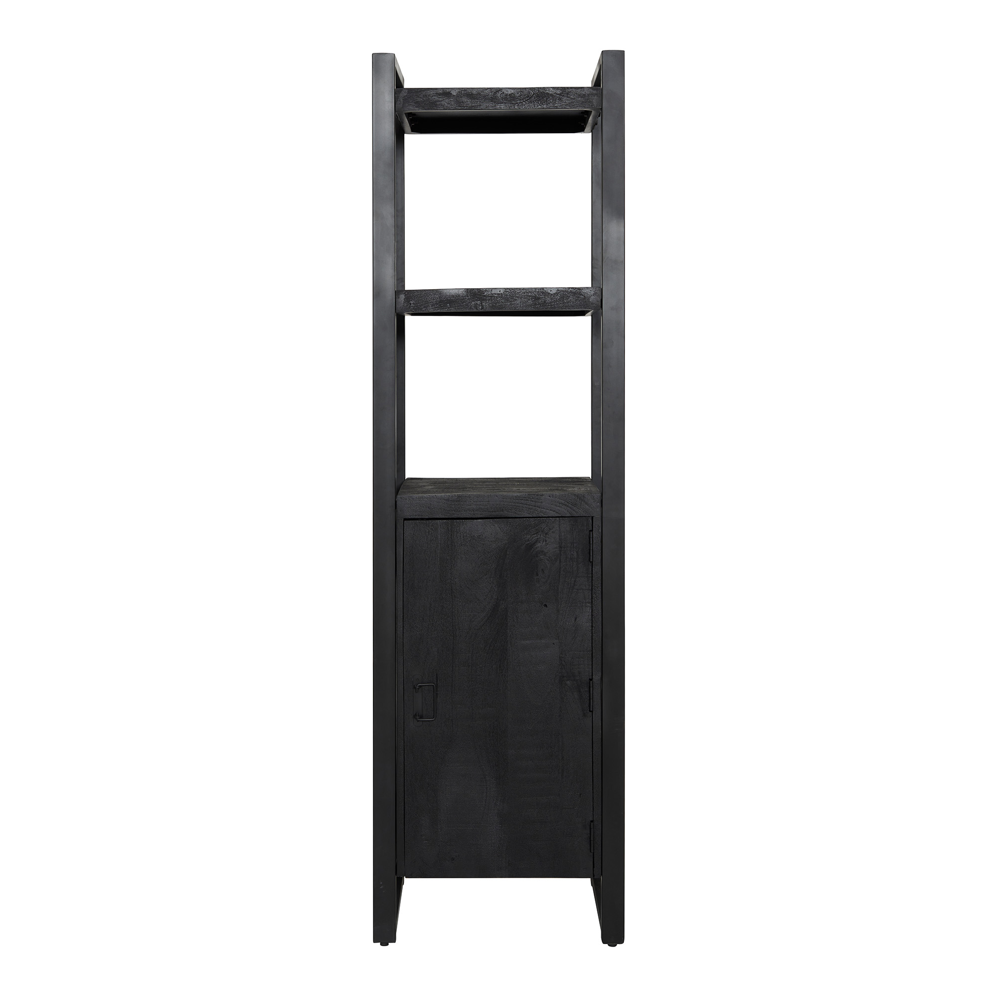 Boekenkast Boaz Zwart is uitgevoerd in het mangohout. Het metalen frame en de metalen handgreep zijn afgewerkt met een zwarte lak. Dit model is voorzien van één deur en twee legplanken. De boekenkast is ingelegd met verschillende stroken zwart gelakt hout, waar het meubel zijn eigentijdse karakter aan te danken heeft. Afmetingen Breedte: 55 cm Diepte: 45 cm Hoogte: 200 cm Onderhoud: Afnemen met een lichtvochtige doek. Montage: zelfmontage.