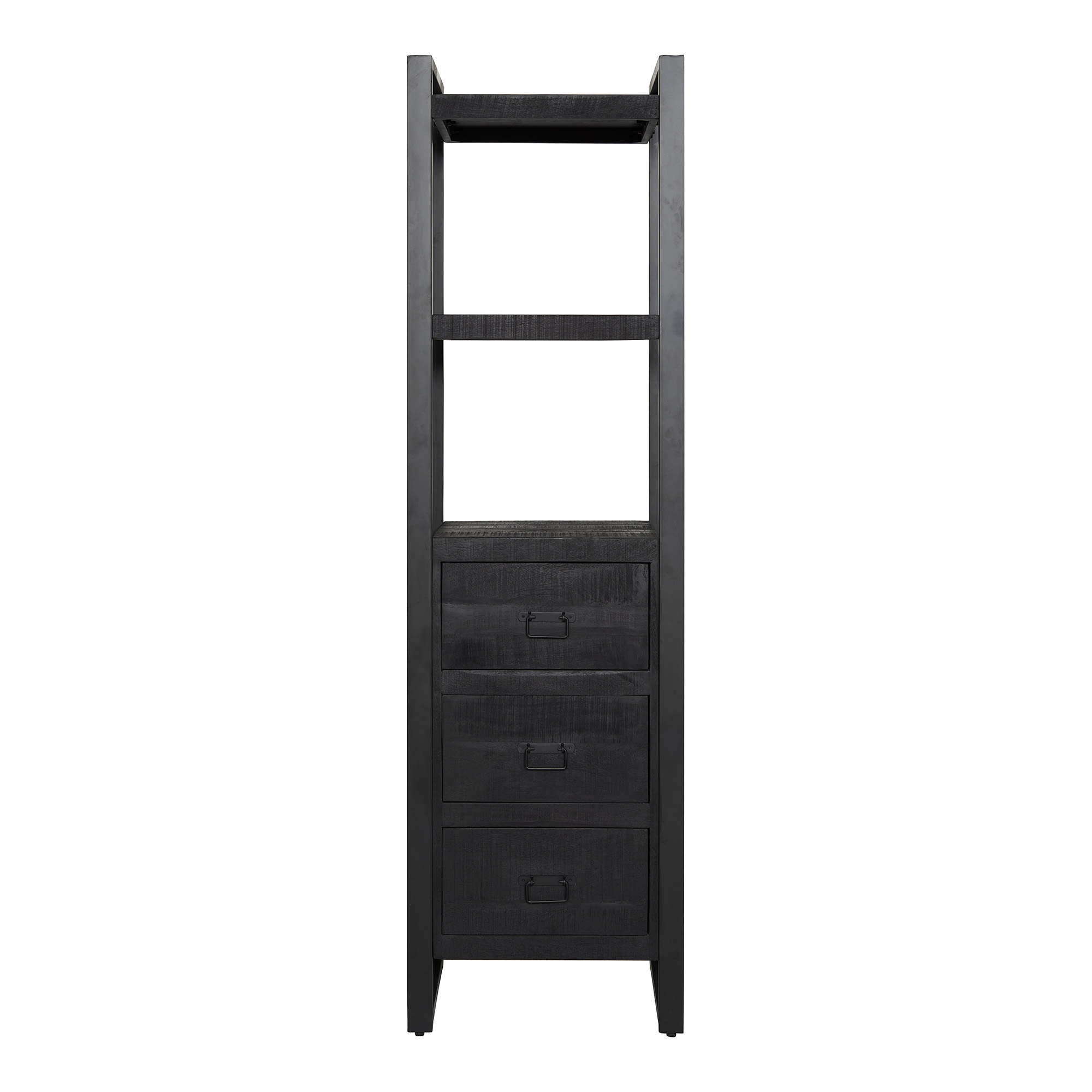 Boekenkast Boaz Zwart is uitgevoerd in het mangohout. Het metalen frame en de metalen handgrepen zijn afgewerkt met een zwarte lak. Dit model is voorzien van drie laden en twee legplanken. De boekenkast is ingelegd met verschillende stroken zwart gelakt hout, waar het meubel zijn eigentijdse karakter aan te danken heeft. Afmetingen Breedte: 55 cm Diepte: 45 cm Hoogte: 200 cm Onderhoud: Afnemen met een lichtvochtige doek. Montage: zelfmontage.