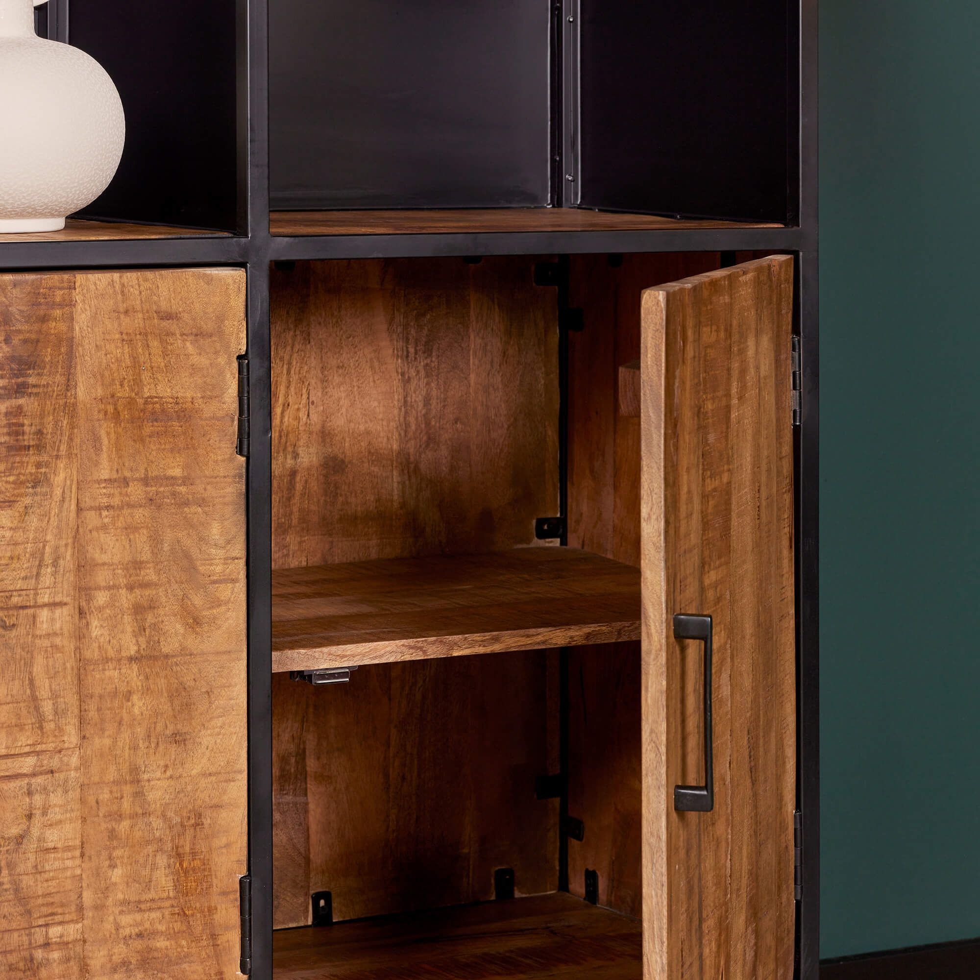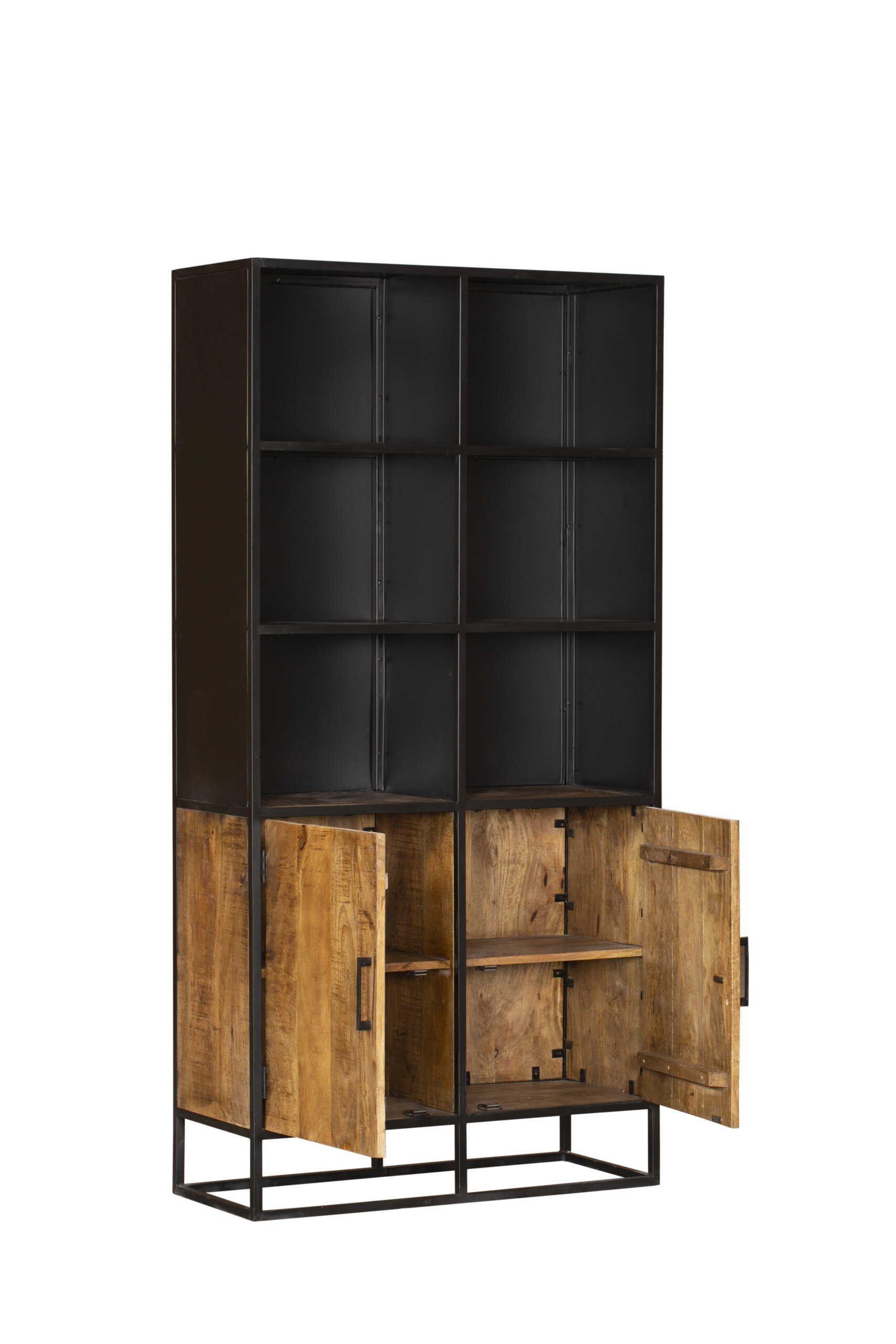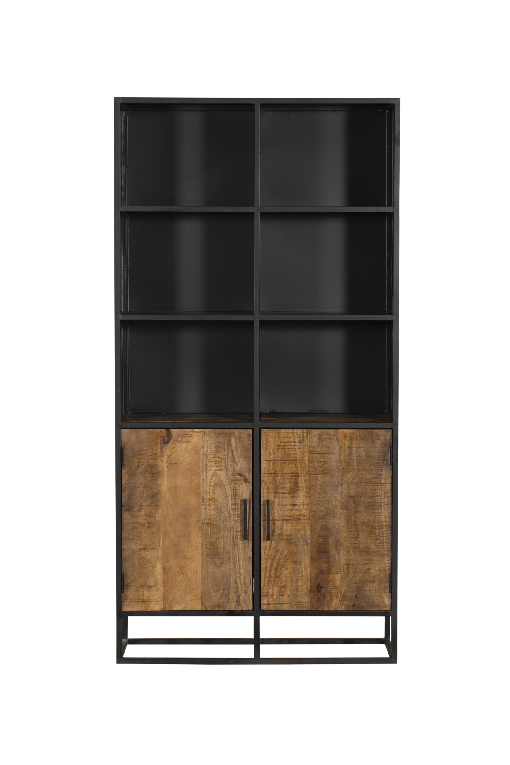 Deze boekenkast uit onze Oakland serie heeft twee mangohouten deuren en vier stalen legplanken. Het frame en de handgrepen zijn gemaakt van metaal en afgewerkt met een zwarte lak.