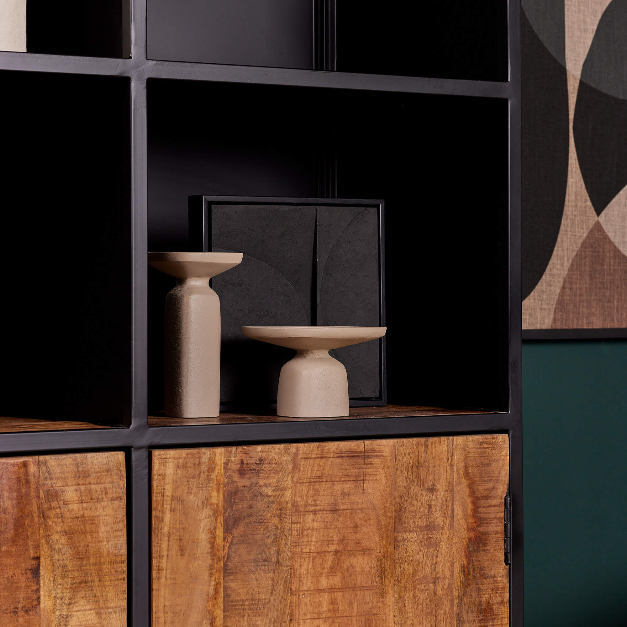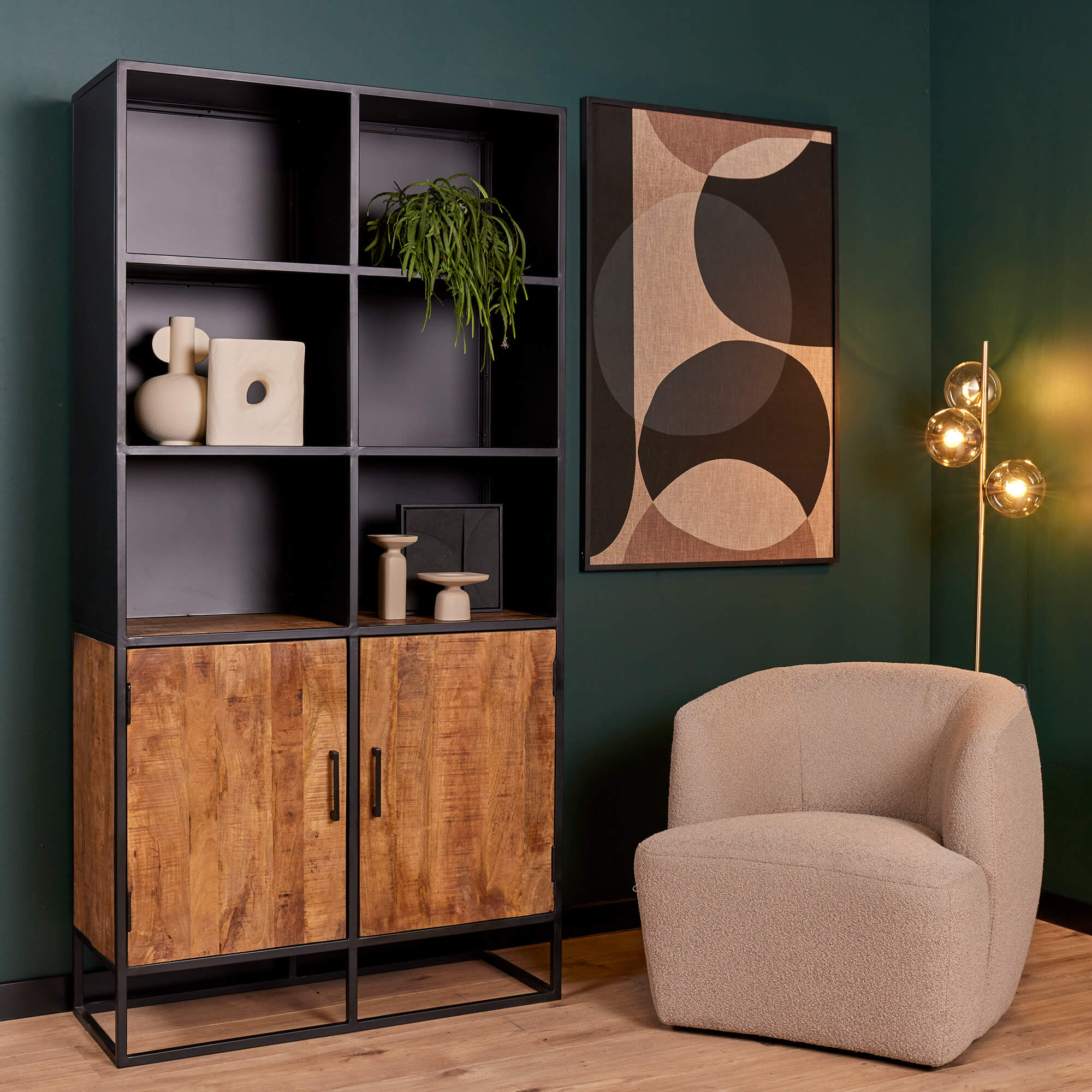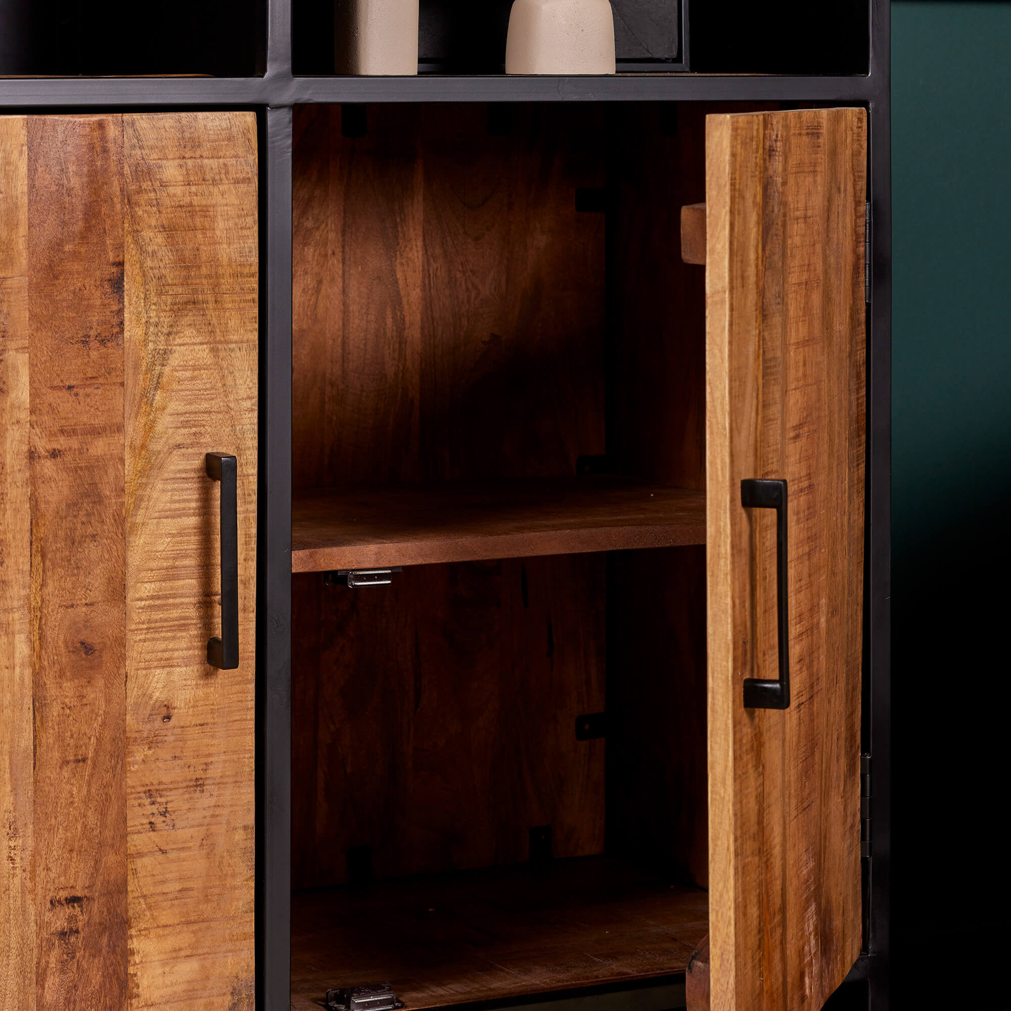 Deze boekenkast uit onze Oakland serie heeft twee mangohouten deuren en vier stalen legplanken. Het frame en de handgrepen zijn gemaakt van metaal en afgewerkt met een zwarte lak.