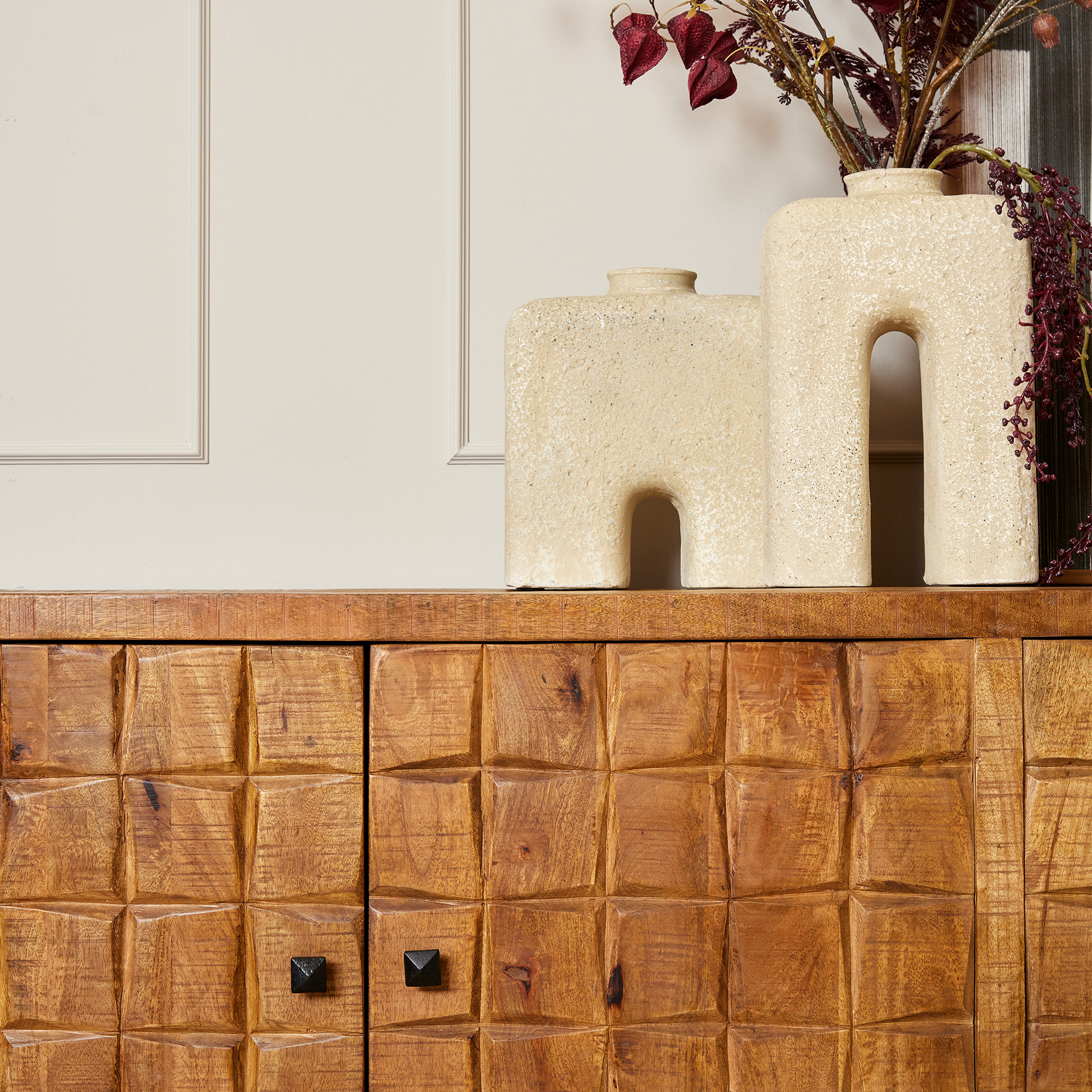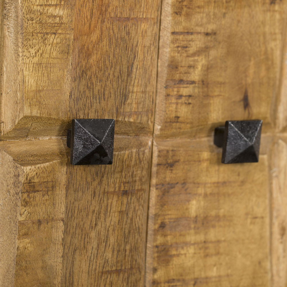 Dressoir Brandy is uitgevoerd in mangohout met een metalen poot. Dit model is voorzien van vier deuren. De kast is ingelegd met verschillende stroken gelakt hout. Het ingesneden blokken patroon geeft de woonserie Brandy van Starfurn een unieke uitstraling. Afmetingen Breedte: 220 cm Diepte: 40 cm Hoogte: 90 cm Onderhoud: Afnemen met een lichtvochtige doek.
