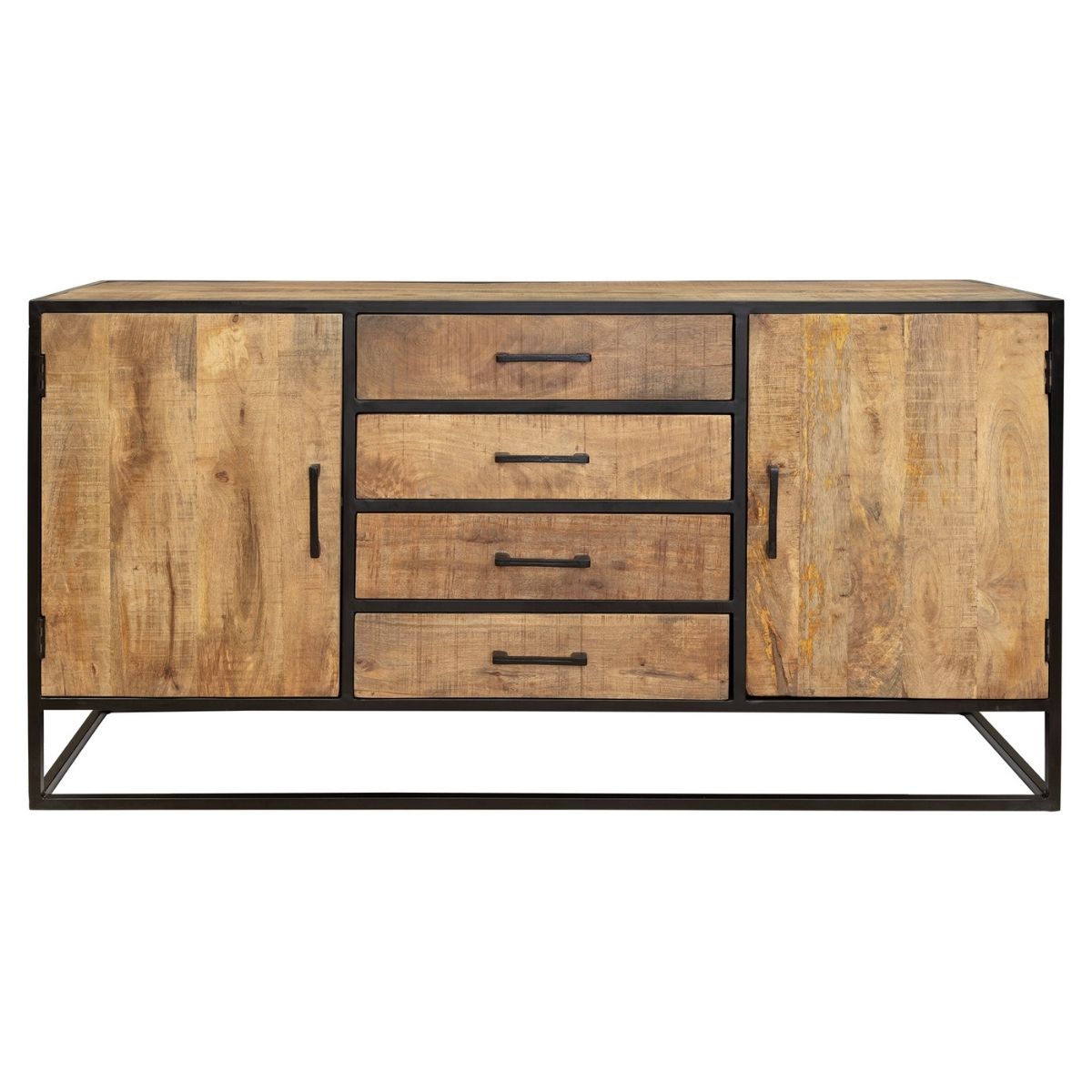 Dit dressoir 'Denver' is uitgevoerd in massief mangohout in combinatie met een metalen frame. Dit model is voorzien van vier lades en twee deuren. Het dressoir is ingelegd met verschillende stroken hout en de metalen elementen zijn afgewerkt met een zwarte lak. Afmetingen Breedte: 165 cm Diepte: 45 cm Hoogte: 85 cm Onderhoud: Afnemen met een lichtvochtige doek.
