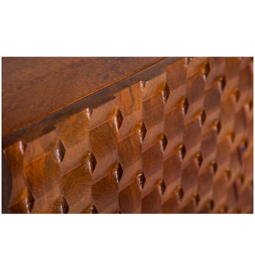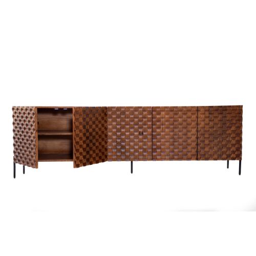 Dressoir Québec is gemaakt van massief mango gelakt hout. De deuren zijn voorzien van een gesneden blokkenpatroon. De kast is voorzien van metalen poten en handgrepen.
