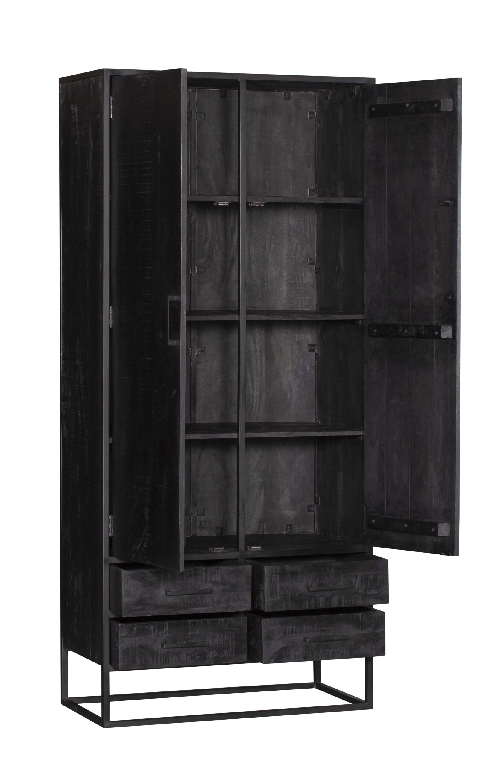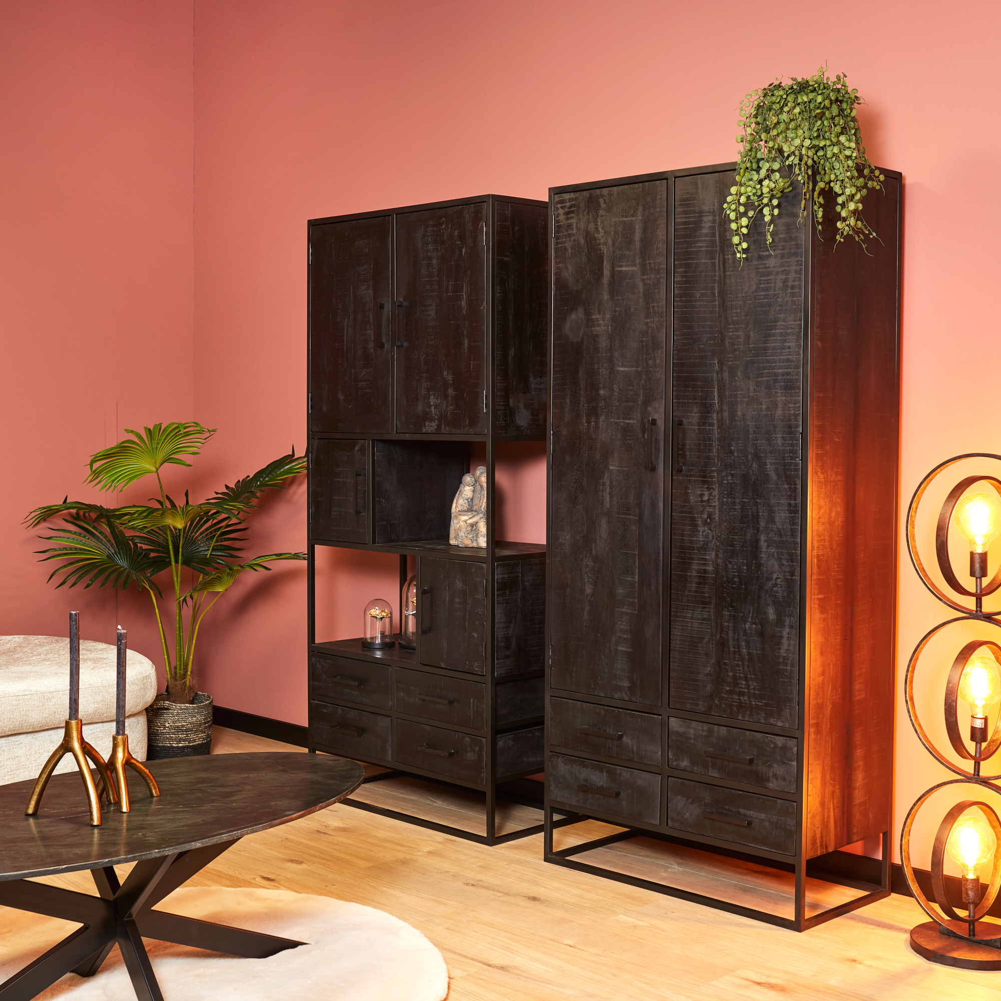 Deze kabinet kast uit onze Denver Black serie heeft vier lades en twee deuren en is uitgevoerd in massief mangohout. Achter de twee lange deuren vind je nog drie extra legplanken. Het frame en de handgrepen zijn gemaakt van metaal en afgewerkt met een zwarte lak. Het mangohout is behandeld met een zwarte lak. Afmetingen Breedte 90 cm Diepte: 45 cm Hoogte: 200 cm Onderhoud: Afnemen met een lichtvochtige doek.