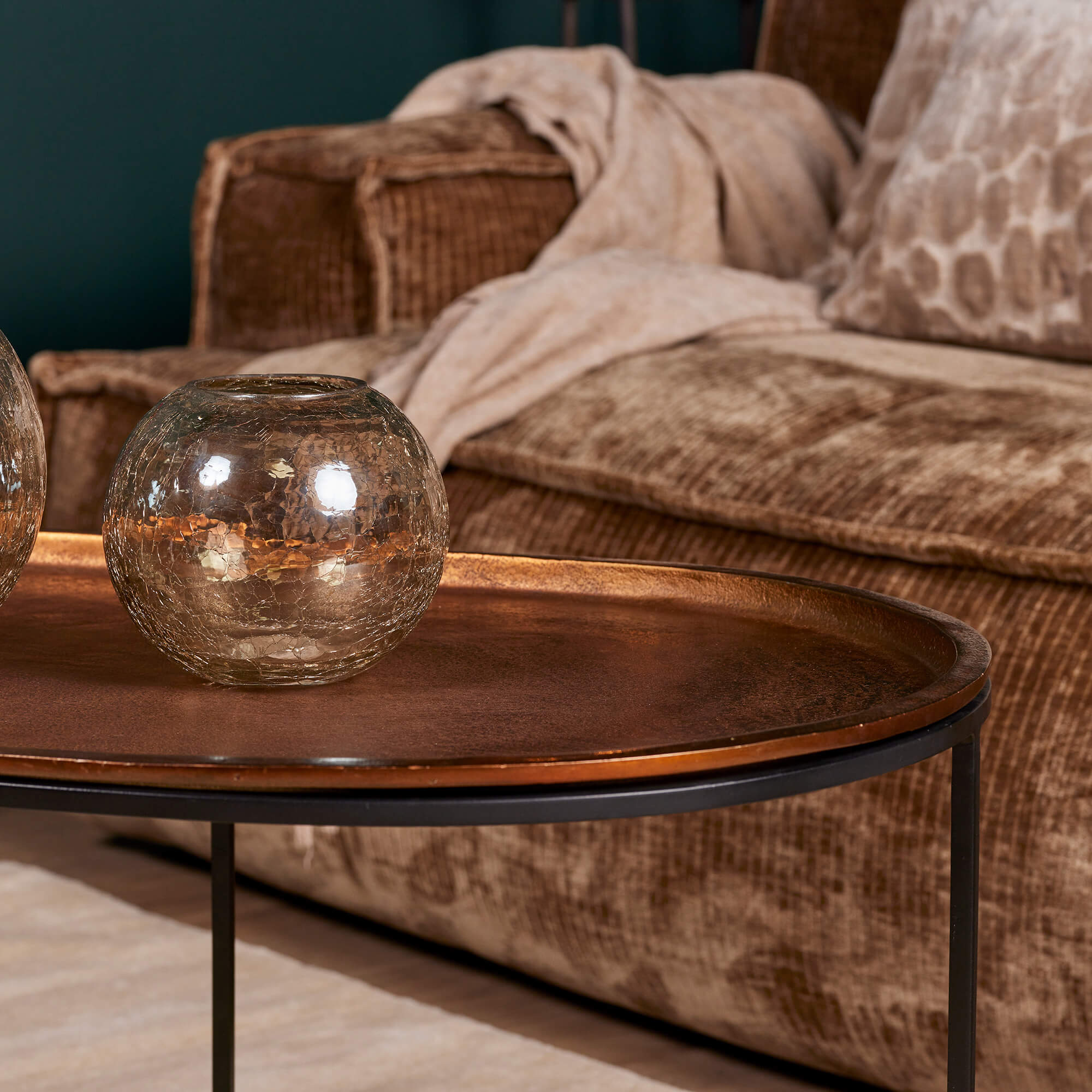Ovale salontafel Brass is gemaakt van aluminium en ijzer. Het blad is gemaakt van aluminium en het onderstel van ijzer. Het blad is afgewerkt met een koperen gouden finish en het onderstel is afgewerkt met een zwarte finish. Afmetingen Breedte: 50 cm Diepte: 86 cm Hoogte: 45 cm Onderhoud: Afnemen met een lichtvochtige doek.