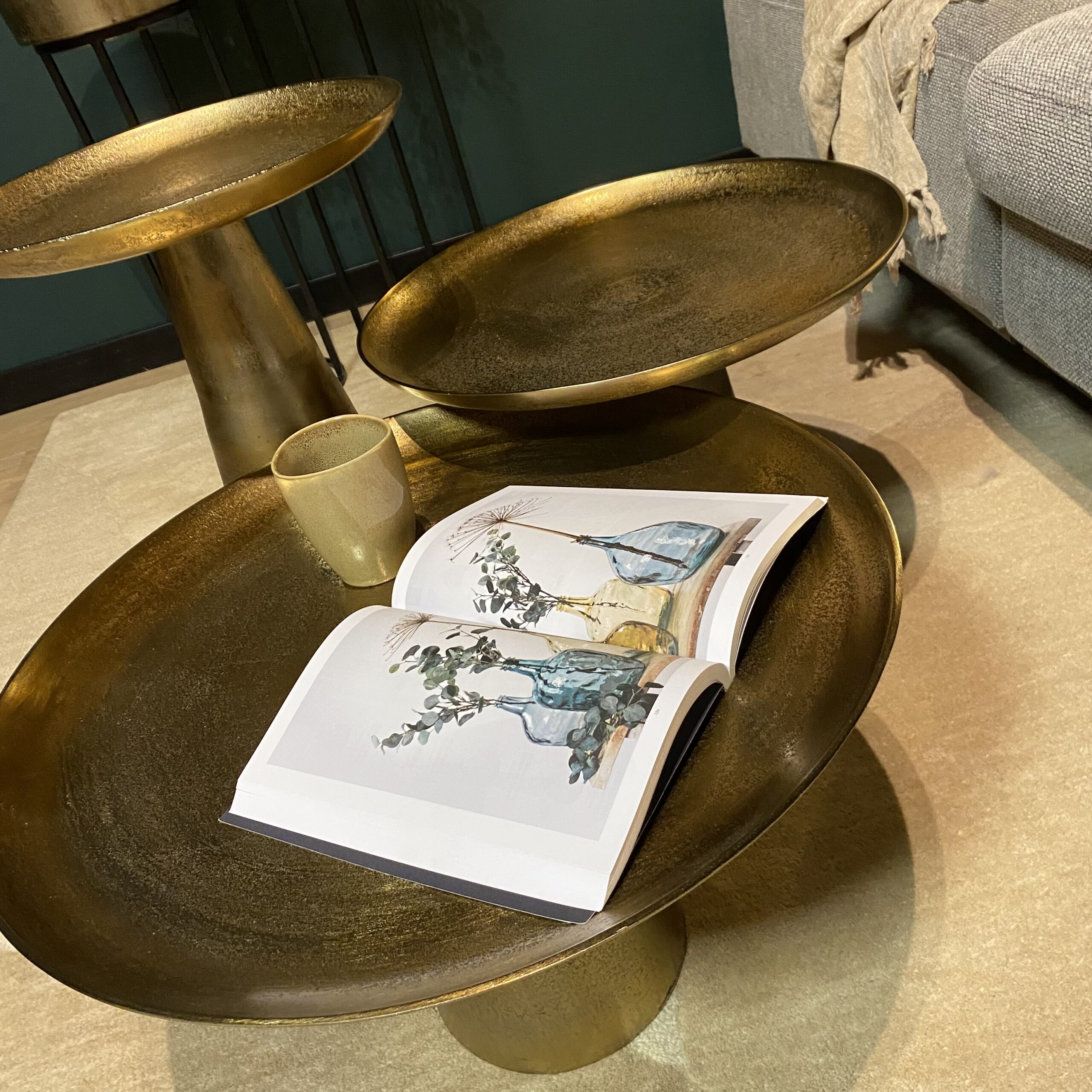 Salontafel Daisy Medium is gemaakt van aluminium. De tafel is afgewerkt met een antiek gouden finish.