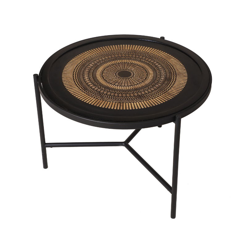 Salontafel Mae is gemaakt van massief zwart gelakt hout. Het blad is voorzien van een houtsnijwerk. De salontafels zijn voorzien van metalen poten.