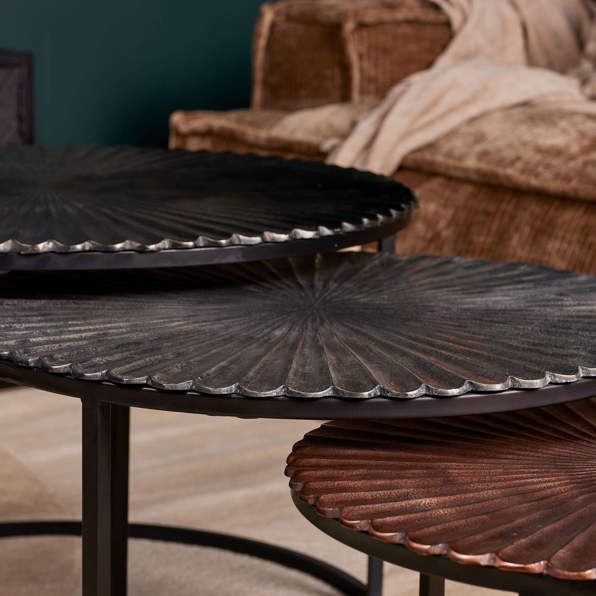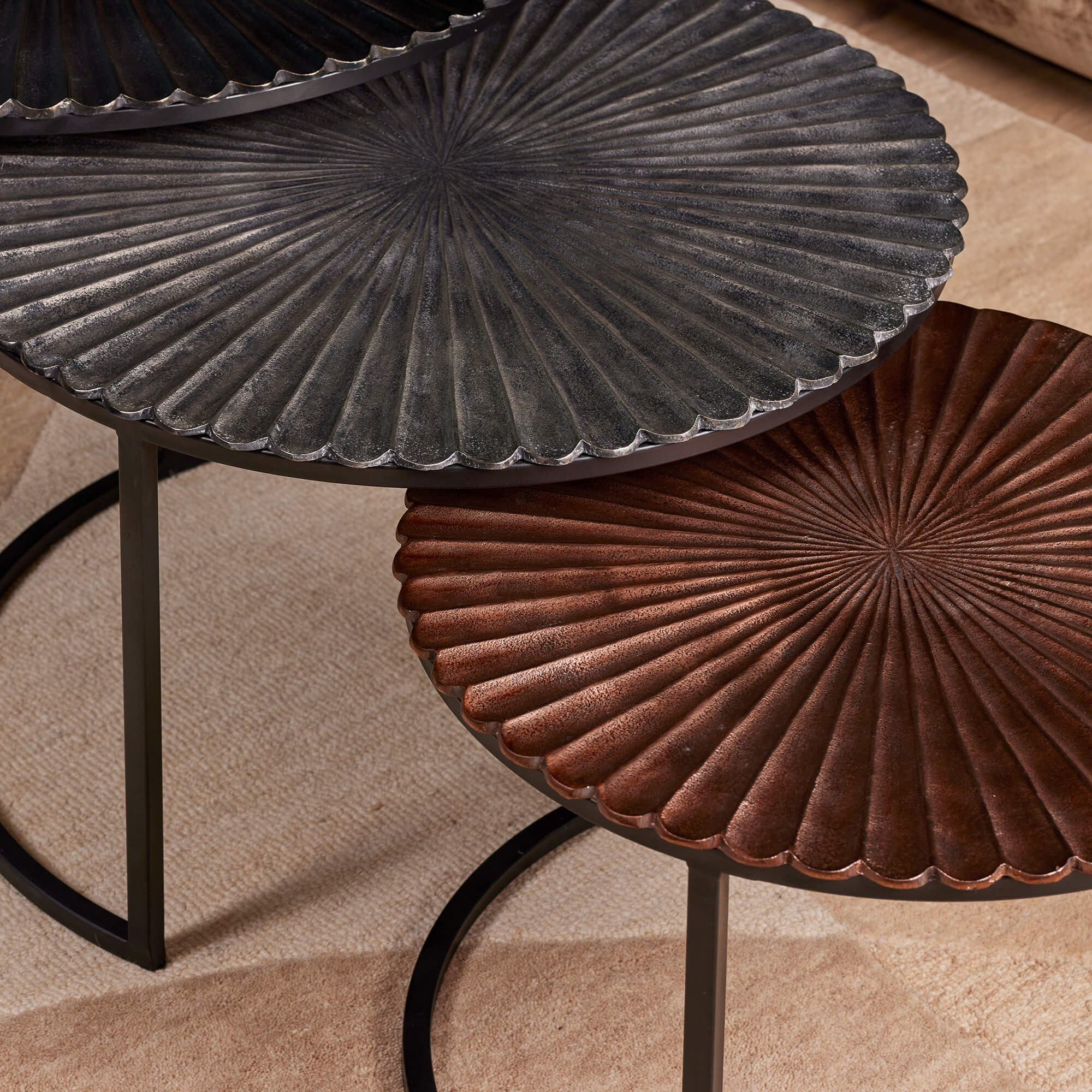 Salontafel set Kris is een set van drie salontafels. De ronde bladen zijn gemaakt van aluminium. De aluminium tafelbladen hebben allemaal hun eigen unieke afwerking. De frames zijn afgewerkt met een zwarte finish. Afmetingen grote tafeltje Breedte: 70 cm Diepte: 70 cm Hoogte: 45 cm Afmetingen middelste tafeltje Breedte: 60 cm Diepte: 60 cm Hoogte: 40 cm Afmetingen kleine tafeltje Breedte: 50 cm Diepte: 50 cm Hoogte: 35 cm Onderhoud: Afnemen met een lichtvochtige doek.