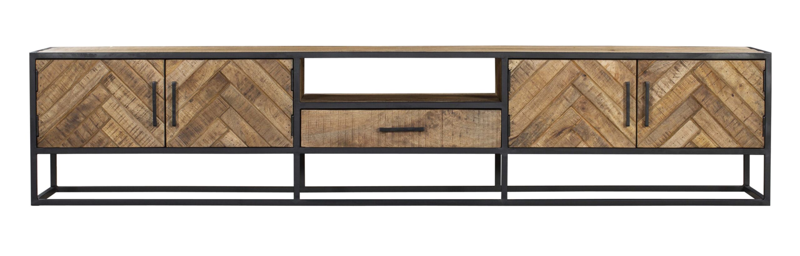 Tv meubel 'Arlington' is uitgevoerd in gelakt mangohout in combinatie met een zwart gelakt metalen frame. Dit model is voorzien van één lade en twee deuren. Het tv-meubel is ingelegd met verschillende stroken hout, waar het meubel zijn eigentijdse karakter aan te danken heeft. De deuren zijn ingelegd in een visgraatpatroon. Dit tv meubel is onderdeel van de 'Arlington serie'. Afmetingen Breedte: 240 cm Diepte: 45 cm Hoogte 50 cm Lade: 65x37x13 cm Open vak: 65x14 cm Onderhoud: Afnemen met een lichtvochtige doek.