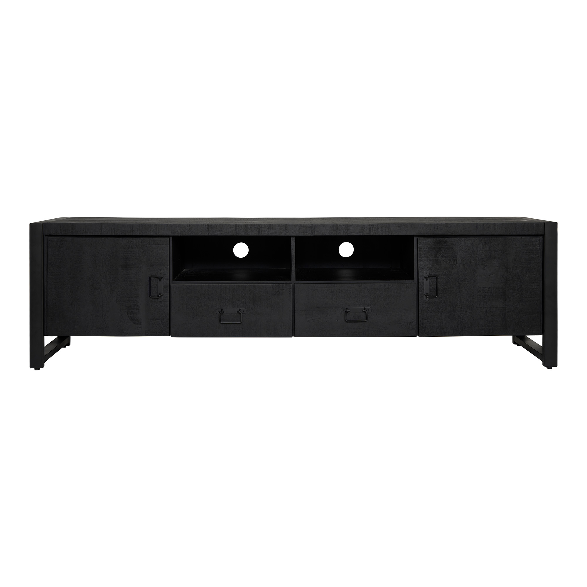 Dit tv-meubel komt uit onze Boaz Black-serie en heeft twee deuren, twee lades en twee open vakken. De kast is uitgevoerd in massief mangohout en metaal. Het mangohout is zwart afgewerkt met een beschermlaag. Het frame en de handgrepen zijn afgewerkt met een zwarte lak. Afmetingen Breedte: 200 cm Diepte: 45 cm Hoogte: 55 cm Onderhoud: Afnemen met een lichtvochtige doek. Montage: Zelf montage.