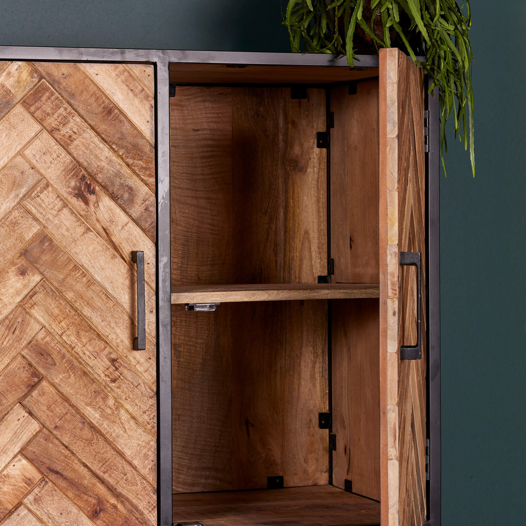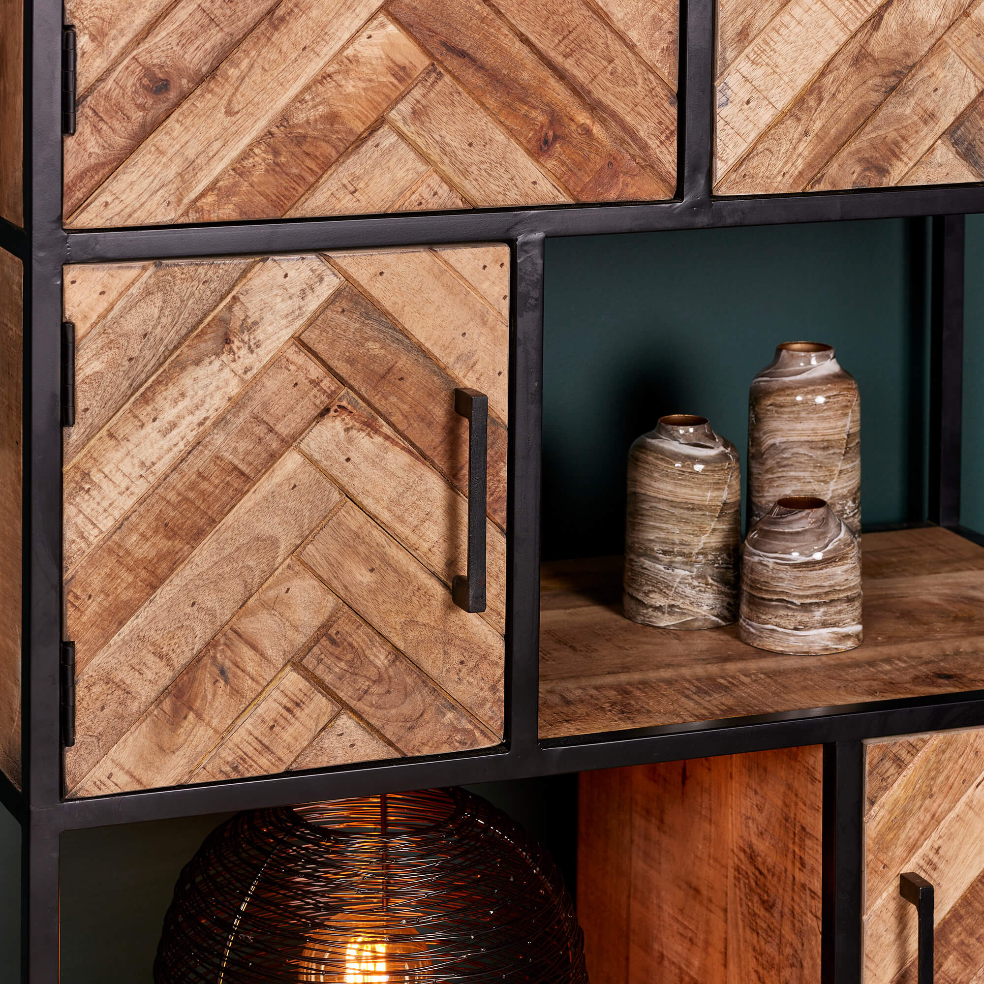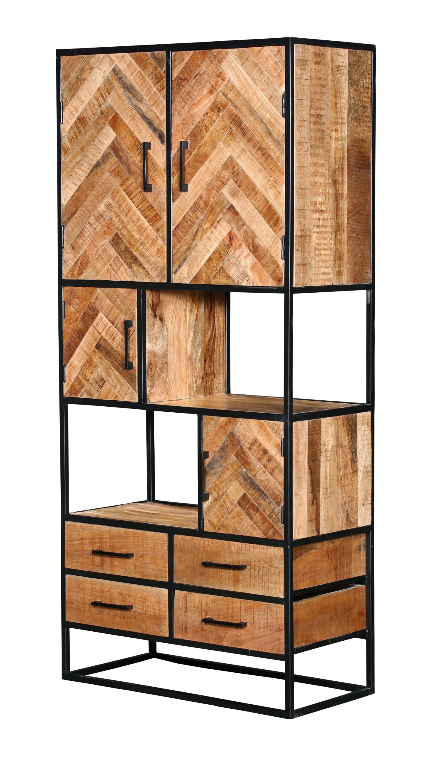 Deze vakkenkast uit onze 'Arlington serie' heeft vier lades, vier deuren en twee vakken en is uitgevoerd in een visgraatpatroon. Achter de twee lange deuren vind je nog een extra legplank. De vakkenkast is gemaakt van mangohout en is afgewerkt met een lak. Het frame en de handgrepen zijn gemaakt van metaal en afgewerkt met een zwarte lak. Afmetingen Breedte: 90 cm Diepte: 45 cm Hoogte: 200 cm Inhoud twee grote kastjes Breedte: 41 cm Diepte: 41,5 cm Hoogte: 71 cm Inhoud twee kleine kastjes Breedte: 30 cm Diepte: 41,5 cm Hoogte: 35 cm Inhoud lades Breedte: 38 cm Diepte: 36 cm Hoogte: 11 cm Onderhoud: Afnemen met een lichtvochtige doek.
