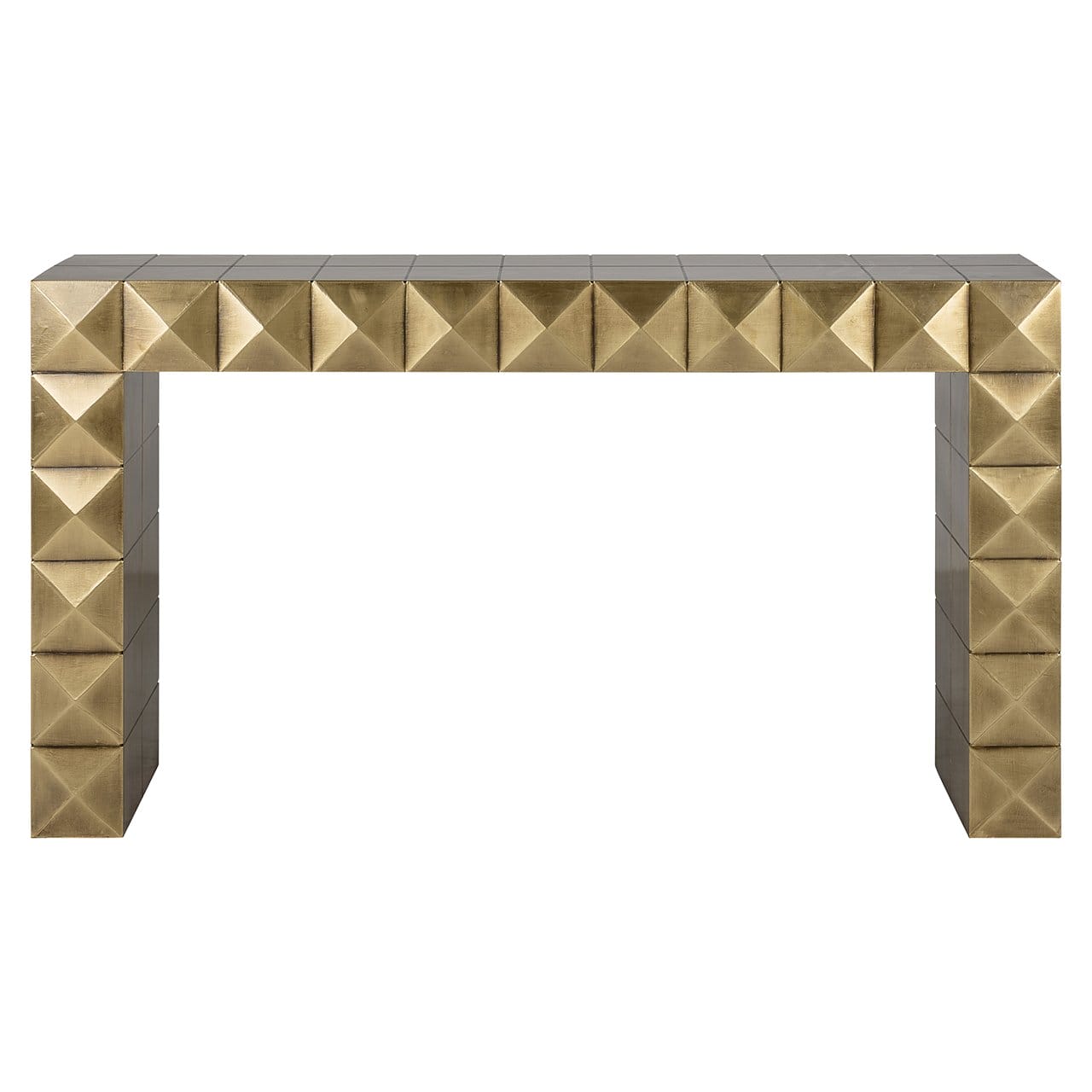 De wandtafel Collada is een uniek Richmond-ontwerp, met een goudkleurige afwerking en een opvallend piramidemotief. Deze wandtafel voegt een vleugje glamour en stijl toe aan elk interieur. Het gouden kleurenschema zorgt voor een luxe uitstraling, terwijl het piramidemotief een decoratief element toevoegt dat de aandacht trekt. De wandtafel is zorgvuldig ontworpen met oog voor detail en vakmanschap. Of je nu een hal, woonkamer of eetkamer wilt decoreren, de Collada wandtafel is een praktische en stijlvolle keuze die functionaliteit en elegantie combineert.