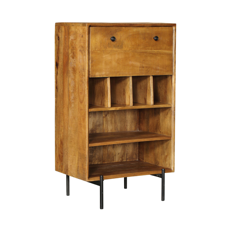 Wijnkast Portland is uitgevoerd in mangohout met een metalen poot. Dit model is voorzien van één klepdeur met daar achter een rek voor wijnglazen. De kast is ingelegd met verschillende stroken gelakt hout. Onder de klepdeur bevindt zich een vak voor vier wijnflessen en daaronder nog twee openvakken. Afmetingen Breedte: 60 cm Diepte: 40 cm Hoogte: 105 cm Onderhoud: Afnemen met een lichtvochtige doek.